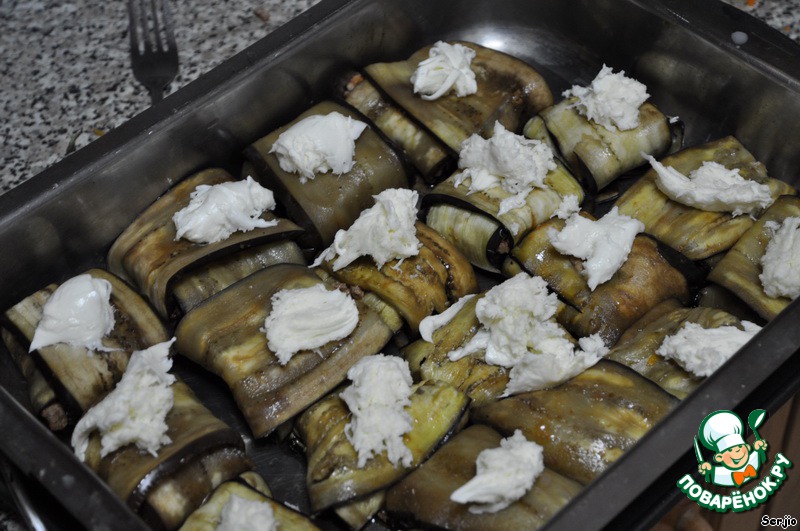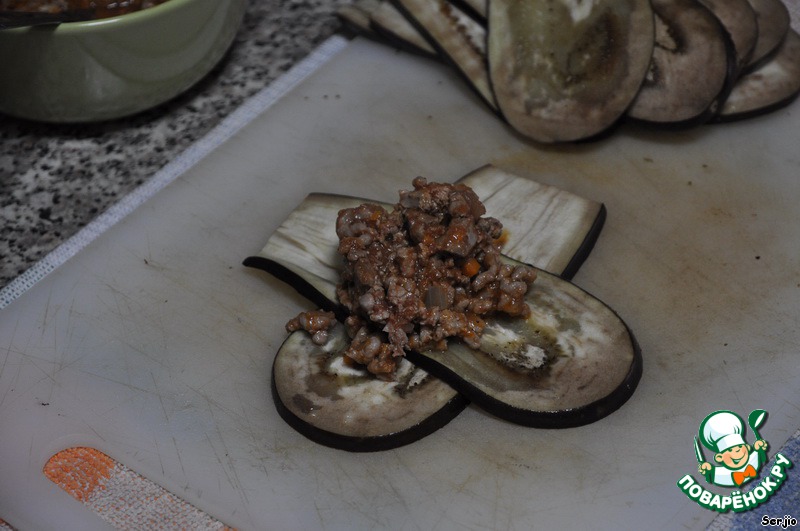 Потом выкладываем наши полоски баклажан крест-накрест и сверху наш болоньез.