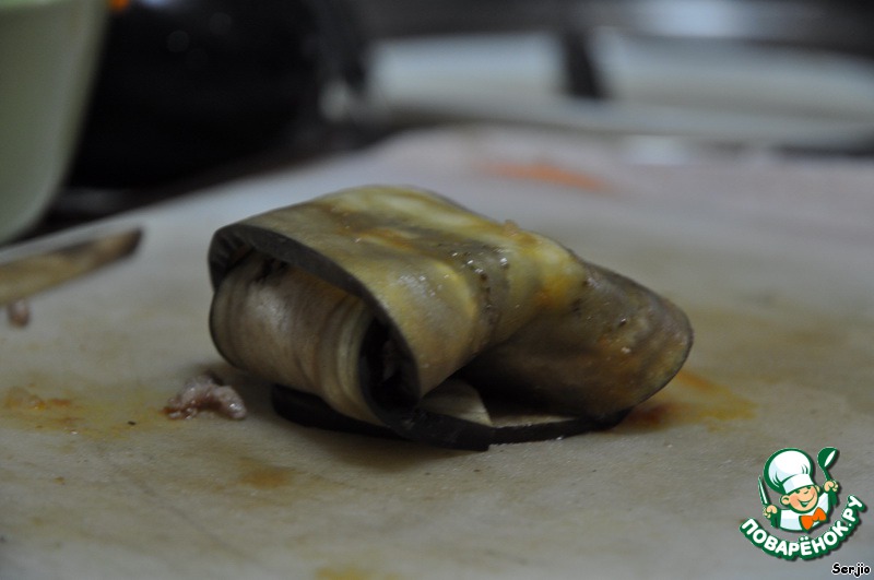 Баклажаны при покупке лучше выбирать подлиннее и поуже, это облегчит их заворачивание. Разрезаем их на тонкие полоски и выкладываем на смазанный маслом противень. Запекаем при 180 град. 5 мин. (до мягкости), примерно вот так: