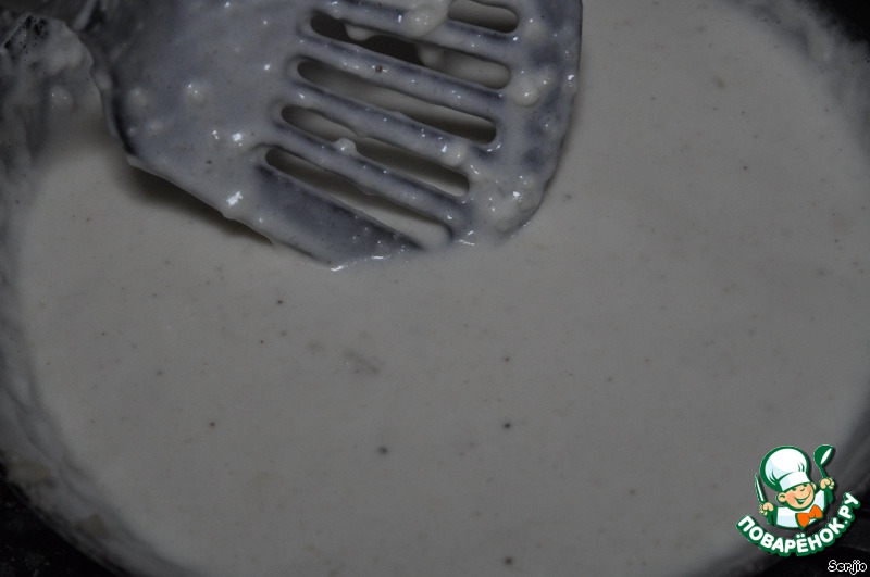 Потом готовим бешамель. Поджариваем муку на масле и разбавляем ее молоком, солим, добавляем мускатный орех, доводим до кипения.