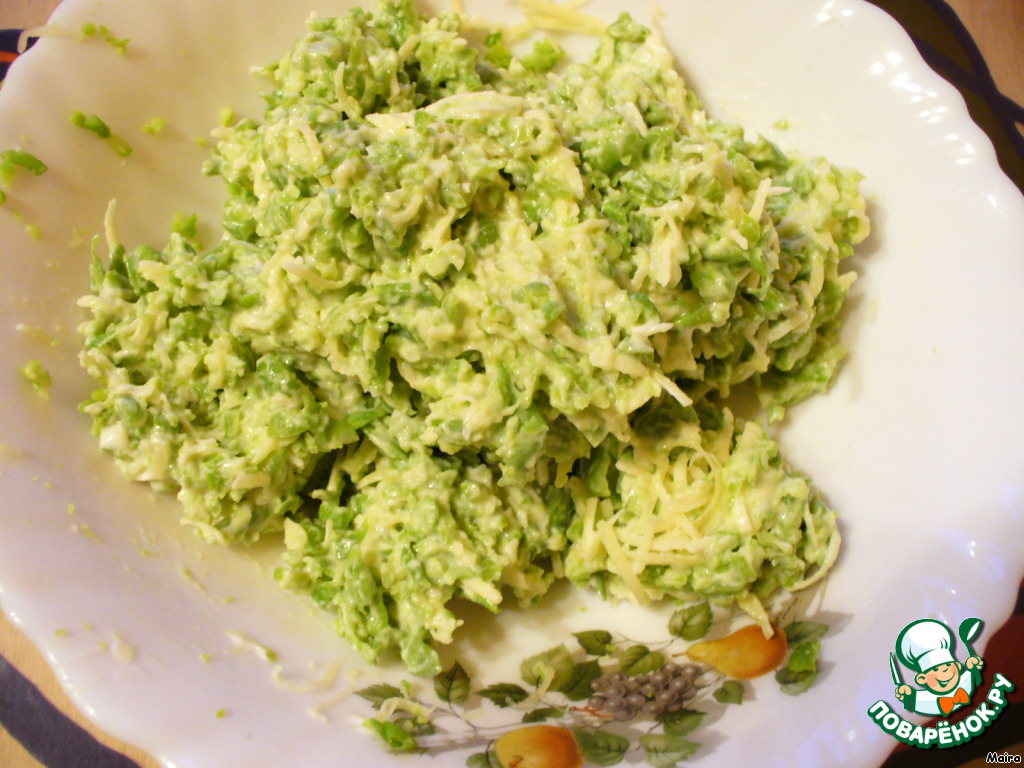 Для начинки. Горошек отварить 3 минуты в кипящей подсоленной воде, измельчить в блендере. Сыр натереть на средней терке.