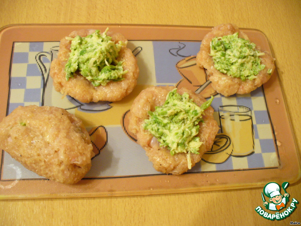 Из полученной смеси сформировать лепешки с углублением в центре. В углубление положить по 1 ч.л. начинки и сформировать котлетки.