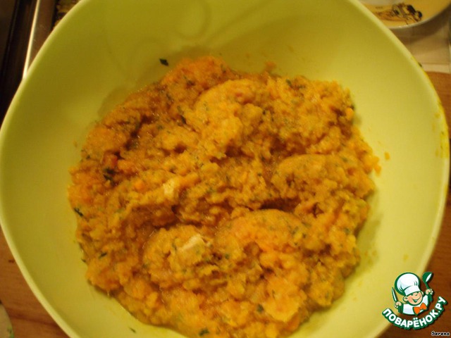 В фарш добавляем нашу кашицу и хорошенько перемешиваем, добавив немного соли и перца.