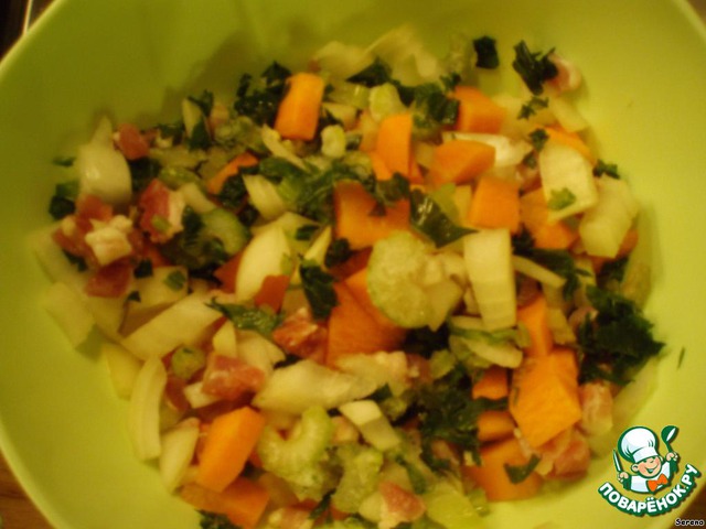Порежем на кусочки лук, морковь, сельдерей, грудинку и размельчим в блендере.
