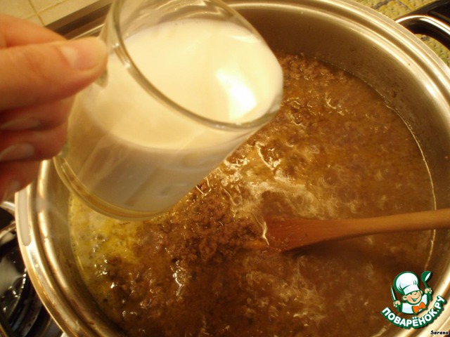 Разогреть молоко и добавить в кастрюлю, перемешивая, оставить испаряться.