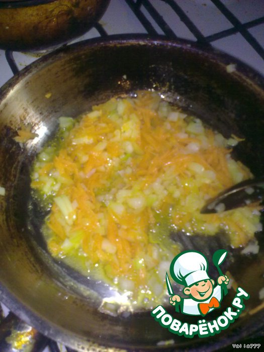 Для начала на разогретой сковороде обжариваем лук, как только он немного подвял, добавляем морковь и тушим ещё 3 мин.