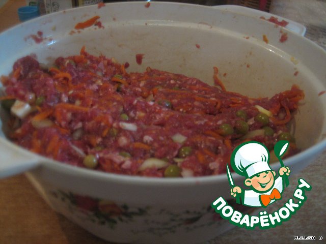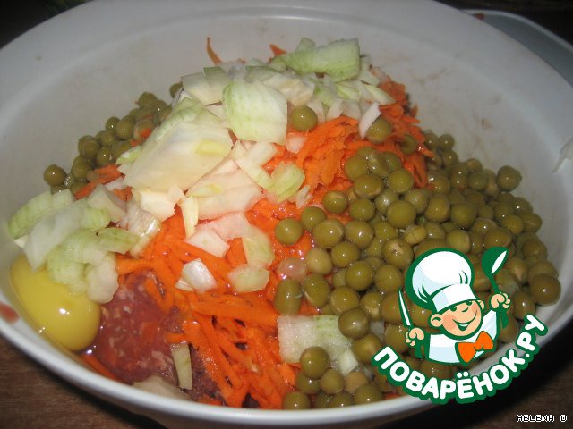 В фарш добавляется измельчённый лук, тёртая морковь, горошек, яйцо,зелень и вегетта.