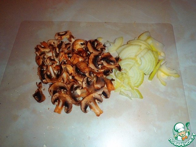 Шампиньоны нарезаем тонкими ломтиками, а лук - четвертькольцами, слегка обжариваем вместе