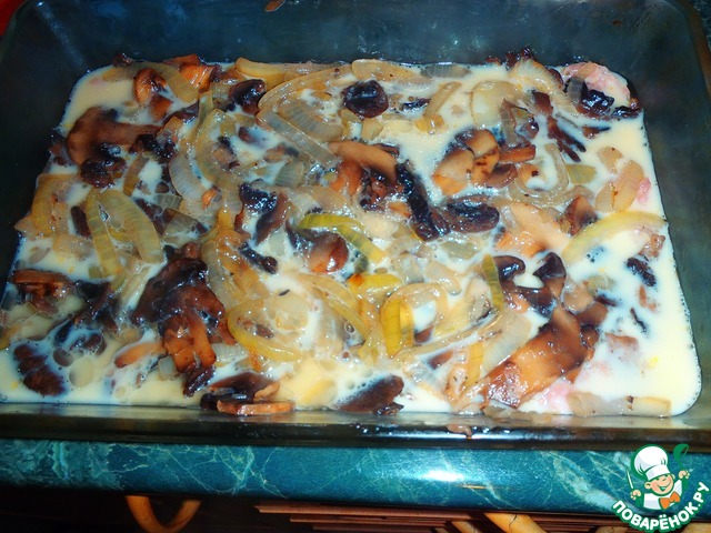 В огнеупорную посуду выкладываем продукты в следущем порядке - тертый картофель, подготовленный фарш, сверху обжаренный лук с грибами. Заливаем все это нашими сливками