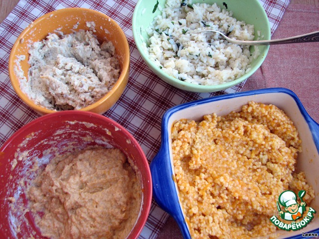 Лук я распределила между рисом, пшенкой и рыбой. Из рыбы и лука блендером сделала фарш. В каждый фарш я положила 3 ст. ложки манки для пышности и связки. В рис и пшенку добавила по ложке рыбного фарша для нежности консистенции. Можно добавить зелень по желанию. Оставшийся рыбный фарш разделила на 2 части и в одну из них положила пару ложек тыквенного пюре. 4 вида фарша готовы.