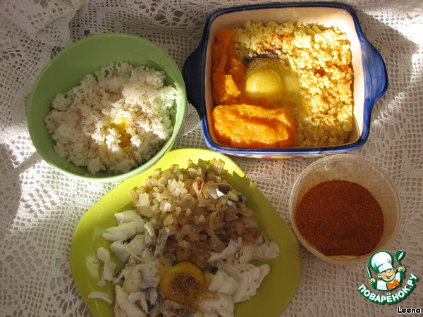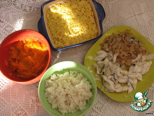 Проведем подготовительные работы :-) Сварим рис, пшенку и тыкву отдельно, добавим по чайной ложке сливочного или растительного масла. Из тыквы сделаем пюре. Рыбу почистим и отварим. Вынув кости, разбираем на филе. Лук слегка обжариваем.
