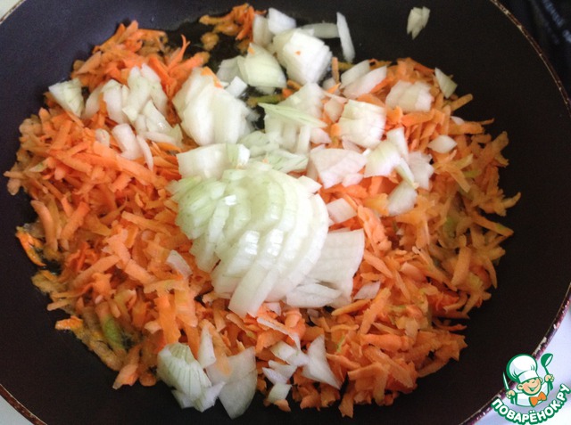 Ставим варить рис. Лук мелко режем кубиками, морковь натираем на терке и ставим обжаривать с 1 ст. л. оливкового масла.