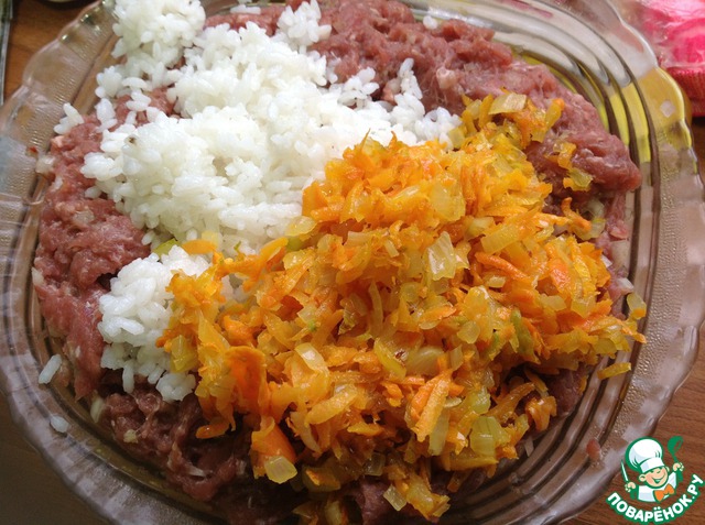 В фарш добавляем остывший рис и морковь с луком, перемешиваем