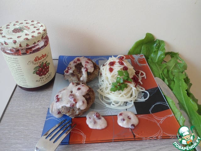 Выкладываем котлетки на тарелочку, поливаем соусом, гарнир можно подавать любой на ваше усмотрение, будь то картофельное пюре, овощи, рис, гречка. У меня сегодня "макаронное настроение", поэтому гарнир - спагетти. Блюдо готово!