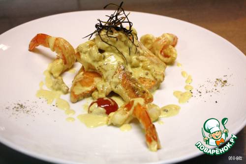 Лосось разделываем на филе (заготавливаем 4 брусочка). Обжариваем со всех, гасим белым вином и коньяком, выпариваем, добавляем сливки, шафран. Солим. Перчим, в конце добавляем 1 рубленную креветку и остальные целиком. Доводим до готовности.