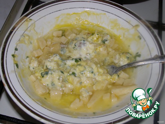 Смешать нарезанную кубиками брынзу, сыр,