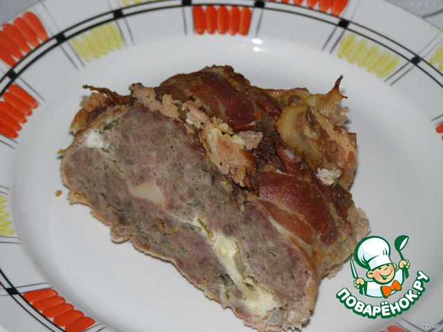 сверху положить оставшийся фарш и свернуть рулет с помощью бекона