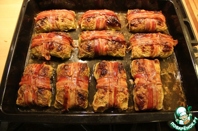 Вливаем куриный бульoн и ставим в разогретую до 200*С духовку на 60 минут. Периодически открываем духовку и поливаем бульoном голубцы.