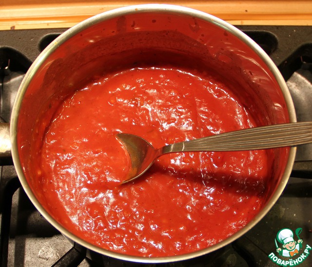 Добавляем 2-3 ложки концентрата томатного, соль и перец по вкусу. Хорошо перемешиваем и добавляем 1 ст. ложку муки. Доводим до кипения. Соус готов.