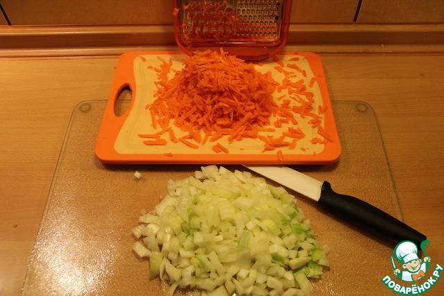 1. Лук обжариваем на оливковом масле до золотистого цвета.