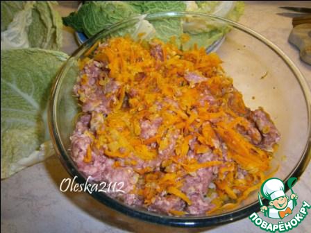 Мясо (говядину и свинину) прокручиваем на мясорубке (50/50). Лук режем, морковь трём на крупной тёрке и всё обжариваем на небольшом количестве растительного масла. За счёт обжаривания овощей начинка становится более сочная и вкусная. Овощи охладить и смешать с мясным фаршем, рисовыми хлопьями, специями, солью.