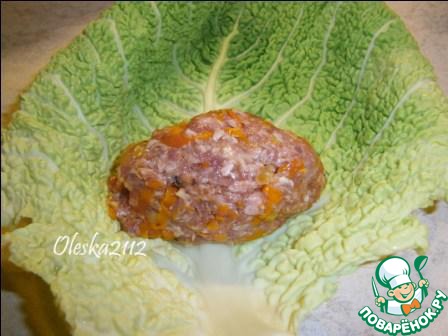 Листья снимаем с капусты, раскладываем на блюдо (5-6 шт) и ставим в микроволновку на пару минут. Вытаскиваем наши листья, они становятся мягкими и податливыми. Раскладываем на столе, формируем из мяса продолговатую котлетку и кладём на лист с той стороны, которая была ближе к кочерыжке.