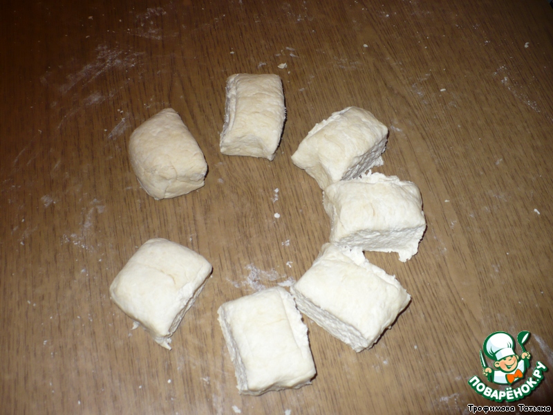 Приготовить тесто. Для этого насыпать в посуду просеянную муку, в нее натереть на крупной терке подмороженный маргарин или масло, слегка перемешать их руками, чтобы получились крупинки. В воду добавить соль и лимонную кислоту или уксус, перемешать. Влить в муку. Замесить тесто. Оно должно быть достаточно тугим. Сформировать из теста брусок, разделить его на 7 равных частей, накрыть салфеткой и поместить в холодильник на 30-40 минут.