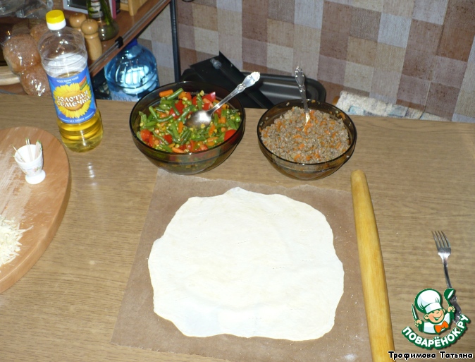 Доставать тесто из холодильника по 1 части. На бумаге для выпечки, смазанной растительным маслом, раскатать круг из теста диаметром около 30 см, наколоть тесто в нескольких местах вилкой