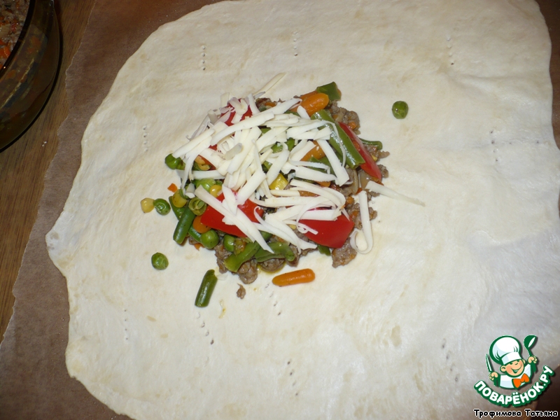 В центр круга положить горкой порцию фарша, сверху порцию овощей, посыпать тертым сыром.