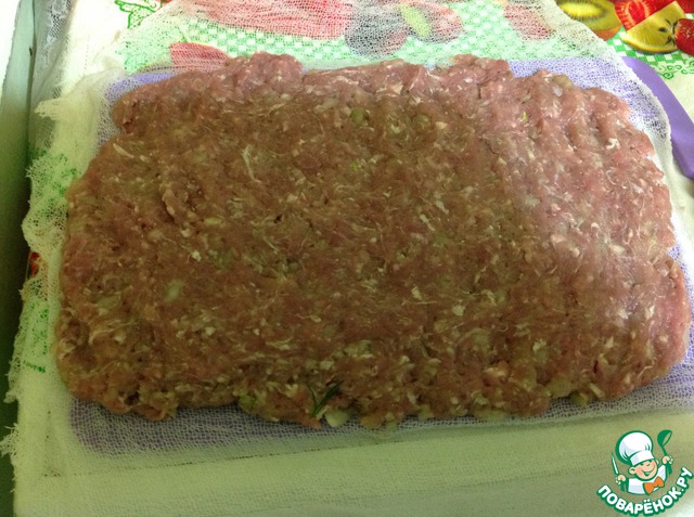 Марлю намочить в холодной воде и расстелить, на нее выложить фарш и руками выровнять толщиной 1 см