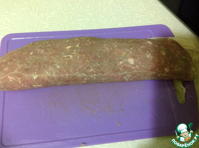 Сверху выложить палочки с начинкой и свернуть в рулет, руками помочь плотно стянуть марлю