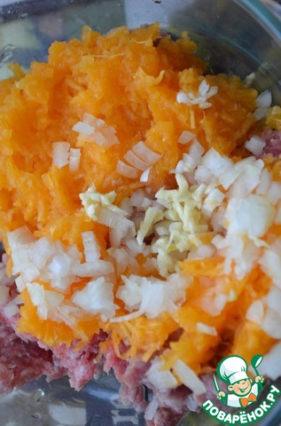 В мясной фарш добавьте тыкву, измельченный чеснок, лук