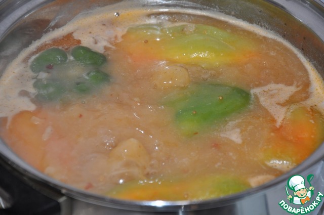 После того, как вода закипит добавляем зажарку и тщательно перемешиваем.. Варим до готовности.