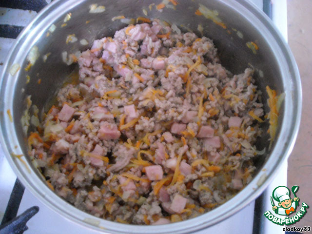 Добавить фарш и нарезанную мелкой соломкой ветчину (я резала кубиками), немного потушить до изменения цвета.