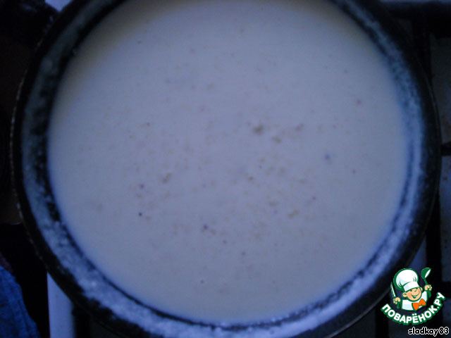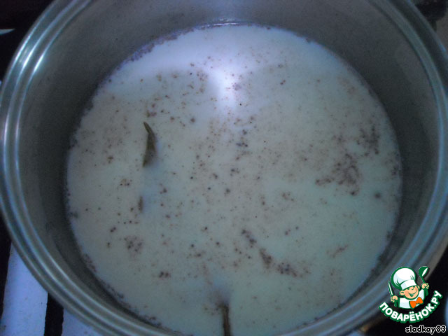 Из молока вынуть лавровый лист и тонкой струйкой, помешивая, влить его в нагреваемую сковороду с мукой. Когда начнет закипать, посолить и выключить огонь.