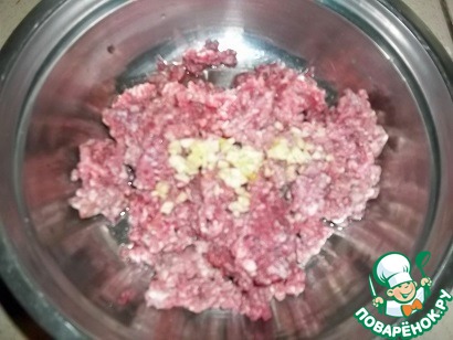 В мясной фарш добавить мелко нарубленный чеснок, соль и жгучий и (или) душистый перец по вкусу. Перемешать.
