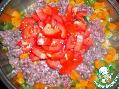 Закрыть крышкой, потушить на небольшом огне 5 минут. Добавить 0.5 стакана мясного бульона или воды и тушить еще 5 минут. Затем добавить мясной фарш и помидоры.