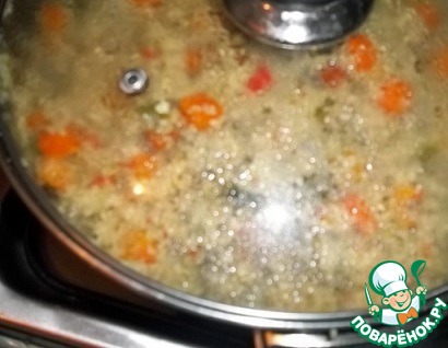 Дать кус-кусу упрется минут 5, еще раз осторожно перемешать, чтобы кус-кус был рассыпчатым, так же можно добавить 1 ст. л. сливочного масла. Снова закрыть крышкой и настаивать еще 5 минут.