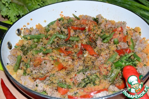 В сковороду к фаршу добавить чечевицу. Обжарить в течении 3 минут.