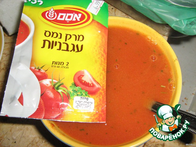 Самое простое - приготовление томатного соуса. Берем любой томатный суп типа "Горячая кружка", размешиваем с кипятком по инструкции. Из двух пакетиков получается примерно пол-литра соуса. В нем уже есть и соль и приправы, только для пикантности я добавляю еще и сладкого соуса чили.