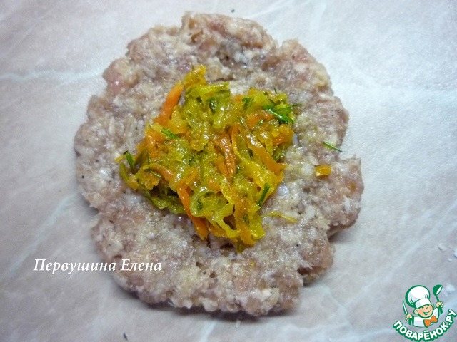 положить в середину маленький кусочек сливочного масла (повторюсь: если фарш жирный - этот шаг пропустить), сверху выложить начинку.