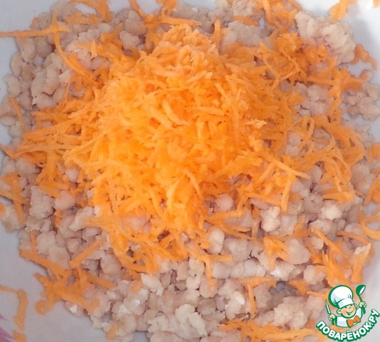 Морковь натереть на мелкой терке и соединить с фаршем.