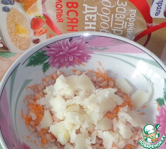 Отварной картофель очистить и измельчить, добавить к фаршу и моркови. Перемешать.
