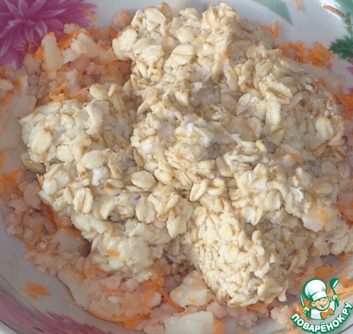 Добавляем хлопья и яйцо, соль по вкусу. Перемешать.