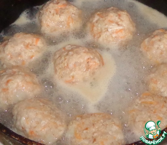 Из полученного фарша сформировать шарики. Наливаем воду в сковороду и выкладываем в нее тефтели. Тушим.