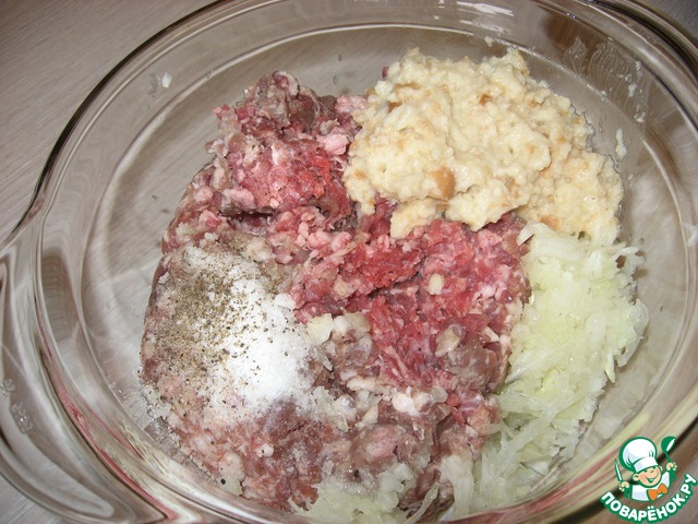 В фарш добавляем соль, перец, лук, замоченный хлеб и перемешиваем, оставляем в холодильнике на 1 час минимум, чтобы все компоненты "подружились".
