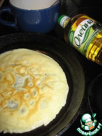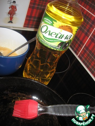 Нагреть сковороду на которой вы обычно жарите блины, кисточкой смазать её маслом"Олейна"