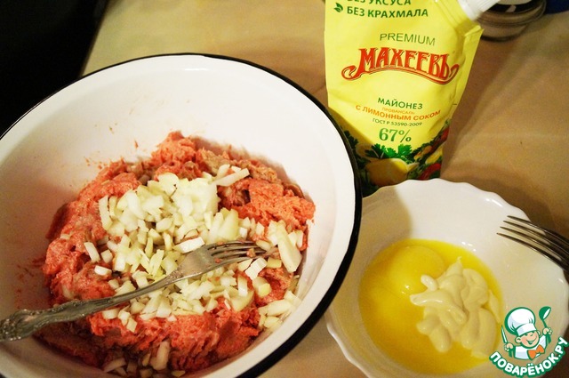 Добавляем в фарш мелко нарезанный репчатый лук. Смешиваем 2 желтка с 2 столовыми ложками майонеза, добавляем в фарш. Заранее замачиваем кусочек белого батона в теплой кипяченой воде, отжимаем и тоже добавляем в фарш. При желании можно добавить любимые специи. Хорошо перемешиваем и солим по вкусу.