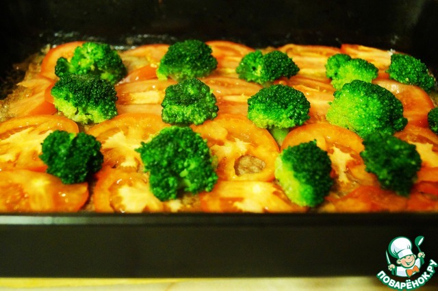 Я наморозила брокколи со своего огорода. Она уже отварена и готова к использованию в блюдах. Небольшие "деревья" из брокколи вставляем в фарш между помидорами. Получился небольшой овощной сад.