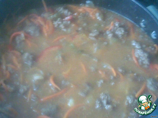 В сковороде обжариваем фарш до золотистой корочки, не забываем слегка посолить. Готовый фарш перекладываем в кастрюльку. Далее обжариваем овощи. Сначала морковь с луком, затем болгарский перец (для остроты можно добавить чили), а также маринованные корнишоны. Обжариваем до готовности и добавляем в кастрюлю с фаршем.