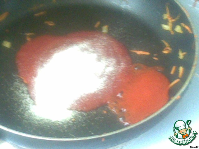 Готовим соус. На раскаленную сковороду кладем томаты, я добавляла в этот раз кетчуп двух сортов чили и томатный, к ним же чеснок, солим хорошенько и добавляем муку. Поджариваем муку и вливаем кипяченую воду, Помешиваем до кипения. Выливаем всю красоту в кастрюлю с фаршем и овощам. Перемешиваем хорошенько, ставим тушиться на минут 15. Подаем со спагетти. Приятного аппетита!
